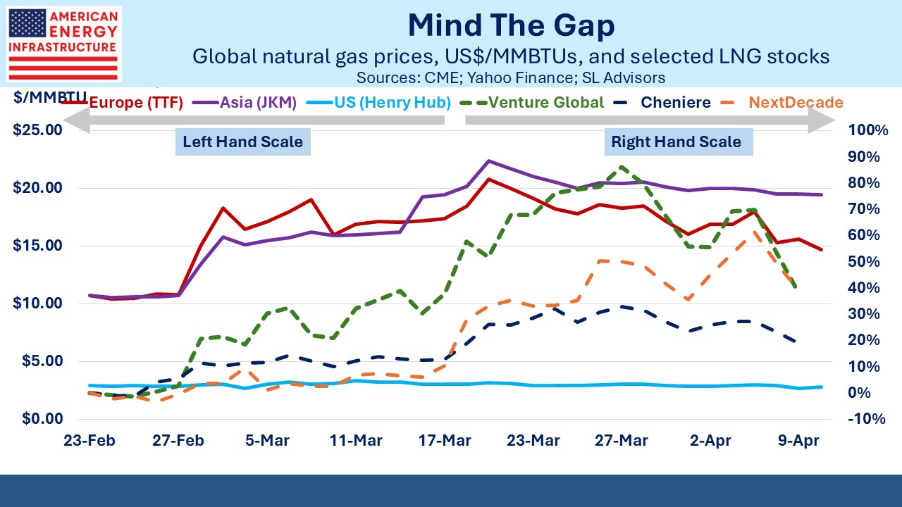 This is why last week’s drop in LNG prices was good for the long term. Exporters want global prices that are just below the point at which buyers start switching to alternatives. Several countries in Asia have increased their use of coal. Japan has given older, less efficient coal plants more freedom to operate. Thailand is restarting previously decommissioned coal power stations. India and the Philippines are planning to use more coal this summer. Meanwhile, NextDecade has filed with the Federal Energy Regulatory Commission (FERC) for a higher maximum work force at their Rio Grande facility in Texas. They’re seeking a cap of 7,500 (versus 5,225 currently) and the ability to work 24/7 on the construction site. An earlier completion date will boost cashflows.