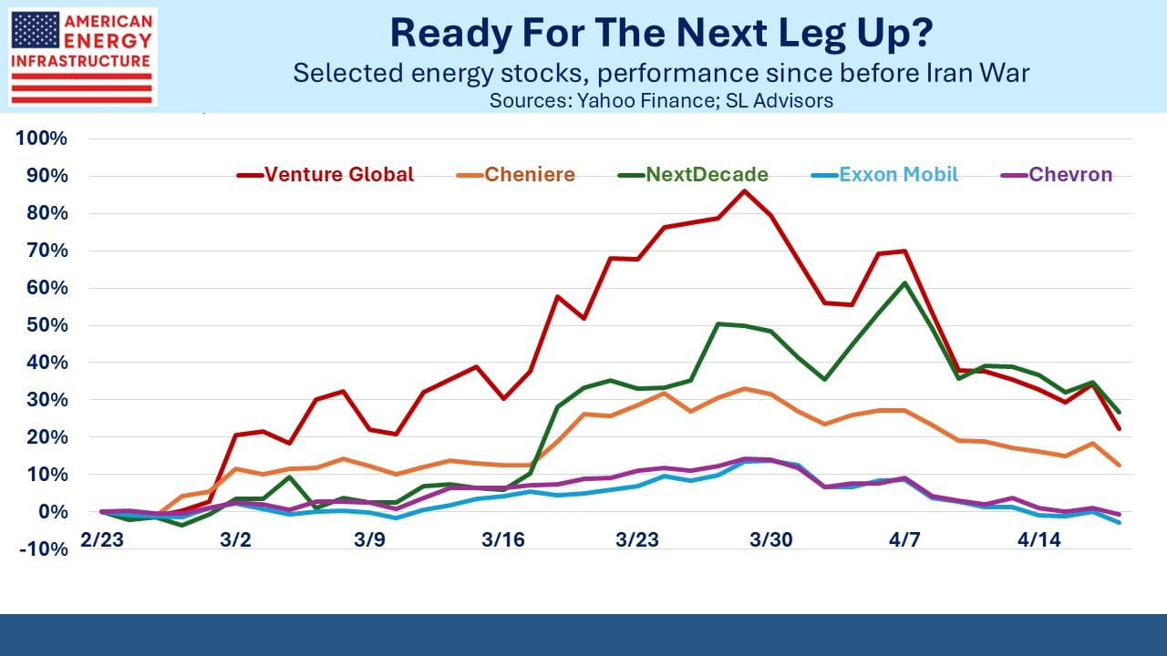 The big integrated oil companies must be worth more than before the Iran War broke out. The LNG names similarly look as if the pullback offers a good entry point. The Energy Information Administration is forecasting that LNG exports will exceed 20 Billion Cubic feet per Day (BCF/D) next year, up from 18.7 BCF/D this year.