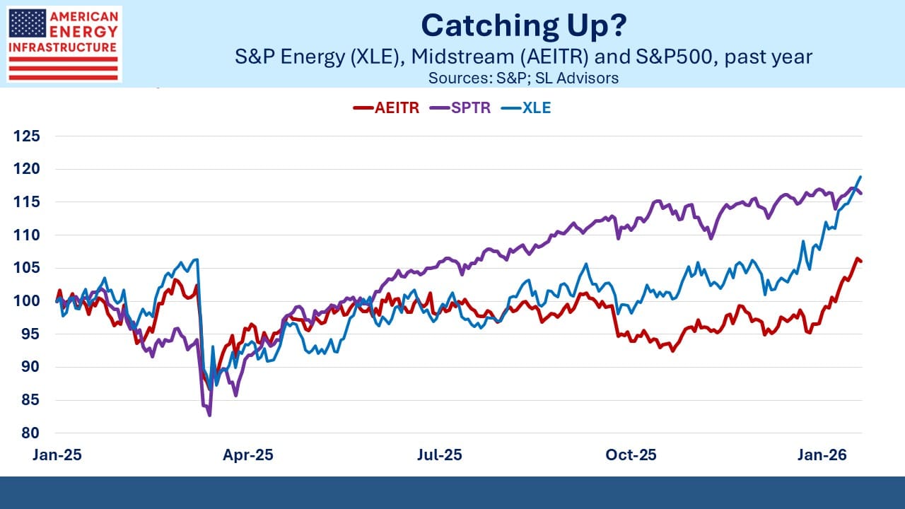 The news for midstream was generally good in January, although to us the sparkling performance was a belated recognition of the already positive fundamentals. ChatGPT guided me to a wildly bullish article from an obscure website (see The Gilded Age of Infrastructure: Why 2026 is the Breakout Year for US Midstream and Energy).