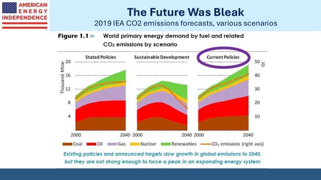 But if you look carefully at the two charts, you’ll see that in 2019 the CPS envisaged Greenhouse Gas emissions (GHGs) rising steadily to almost 50 Gigatonnes (GTs) by 2040. Six years later, the current CPS sees GHGs peaking at below 40 GTs within the next decade.