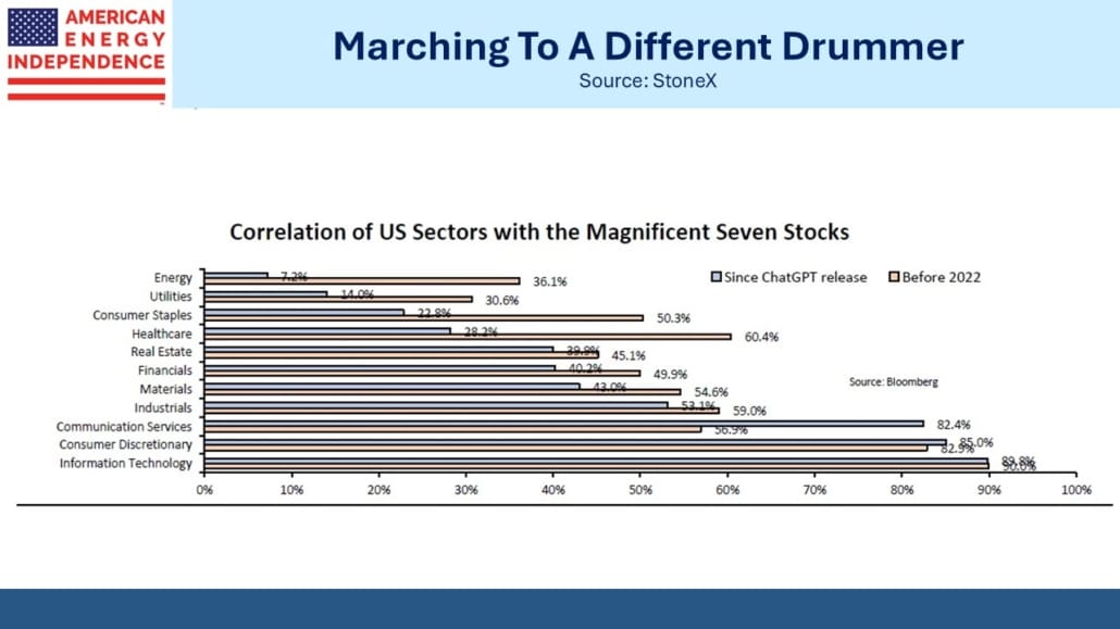 StoneX recently published a bullish case for energy in their Global Macro Report. They note that the futures curve for crude has been in backwardation all year, reflecting strong demand in the spot market. They also note that energy has the lowest correlation of the eleven S&P500 sectors with the MAG7 stocks, something that has become more pronounced since the release of ChatGPT.