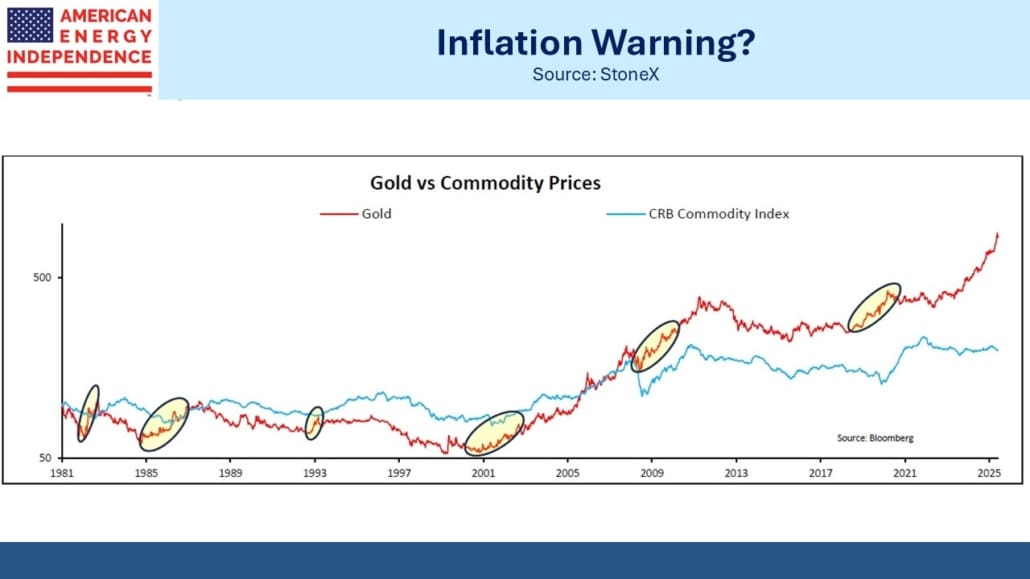StoneX also notes that a rally in gold has often preceded a broader move higher in the CRB Commodity Index. Your blogger has never owned the barbaric relic – there seems little point is spending money to extract, move and store it.