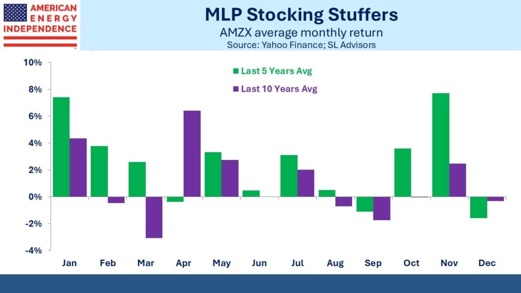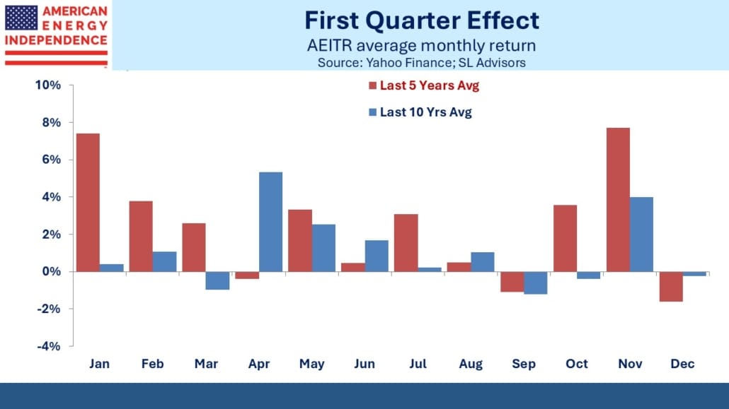 For many years, MLPs had a seasonal tendency to trade up in January. Our theory was that the retail investor base was biased towards December sales and January purchases, in both cases to avoid one more K1. The effect has become more muted, perhaps with greater institutional ownership, but over the past five years there’s still a clear benefit to being invested during the first quarter. This is true both for the Alerian MLP Index (AMZX) which is 100% MLPs and the American Energy Independence Index (AEITR) which is 20% MLPs.