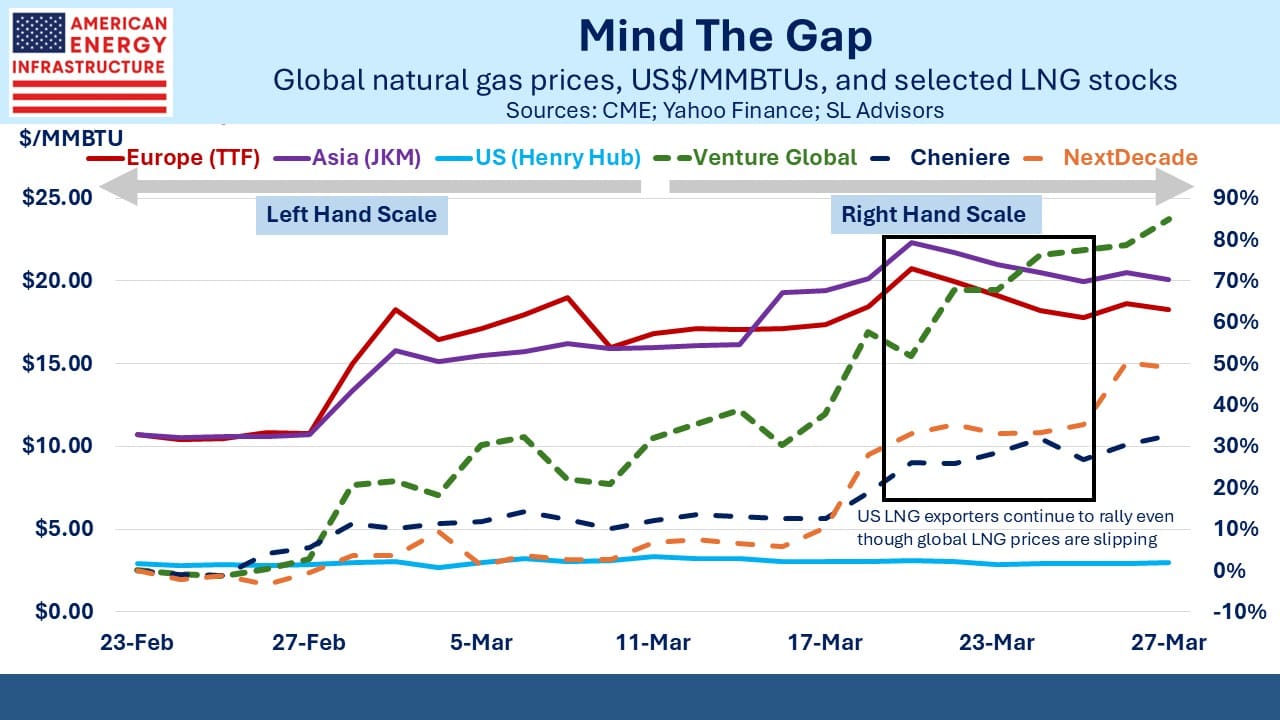 During the first couple of weeks of the war, markets focused on this short term opportunity. The spread between the US natural gas price and foreign benchmarks widened by 50%, creating a substantial profit opportunity for the two leading LNG exporters. Buyers like India whose shipments have been canceled by Qatar’s declaration of force majeure have to scramble to source alternative supplies.