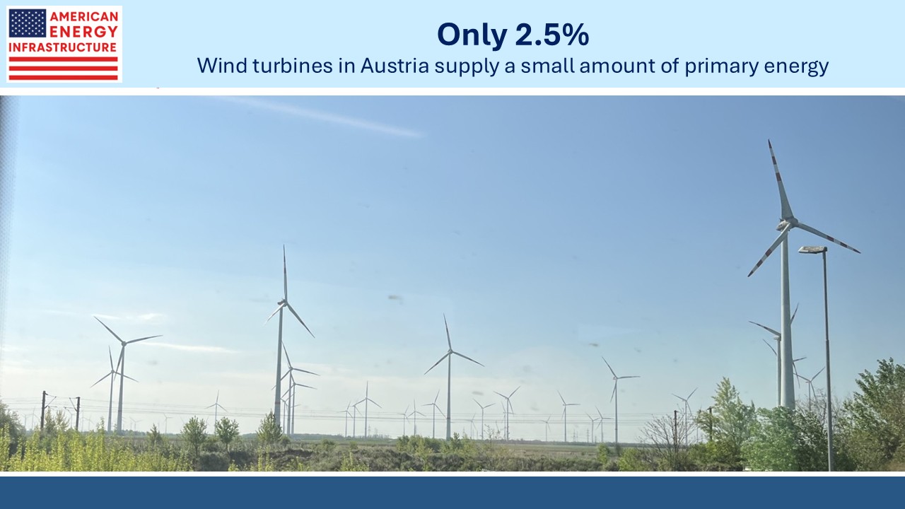 We saw wind turbines covering the countryside on a day trip to Bratislava. Wind provides about 12% of Austria’s power. However, since electricity is only 11-12% of their primary energy, wind is around 2.5% of that. Like most countries, they’ve found that it’s easier to increase renewables than to boost electrification.
