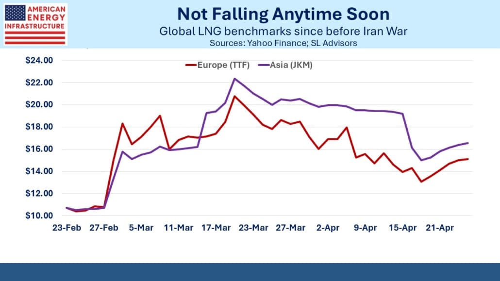 Europe is feeling the effects of the Iran War more keenly than the US, where the most visible impact has been to push gasoline above $4 per gallon. Globally, natural gas prices moved higher again last week and now sit halfway between their pre-war level and the highs reached in early March. Crude oil has similarly pulled back from its highs earlier last month, although spot transactions are at $20 or more per barrel above front month futures.