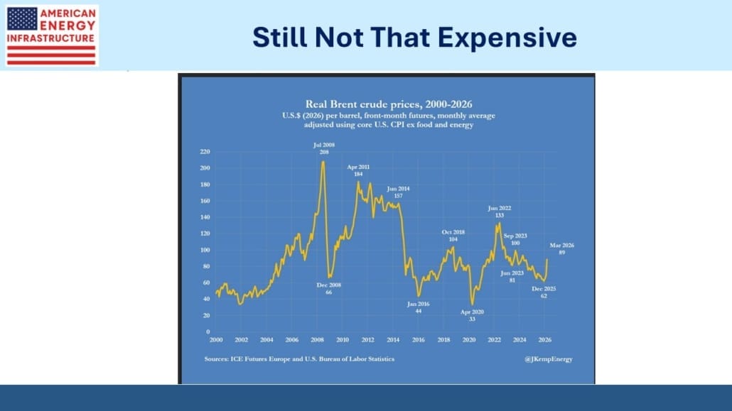 Crude oil prices sank following Monday’s wild market but edged up later in the week. But adjusted for inflation, they are below the average of the past quarter century, and still well below the levels hit in 2022. Energy analyst John Kemp argues that this reflects complacency among many market participants about how long the disruption will last. He points to May 2027 oil futures which have risen by $15, less than half the increase in May 2026 futures.