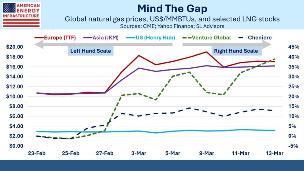 Global LNG prices remain elevated. Qatar’s closure of its LNG liquefaction facility in Ras Laffan almost two weeks ago caught European and Asian importers exposed. Even though LNG trade is still only 14% of global consumption, replacing those canceled cargoes is hard.