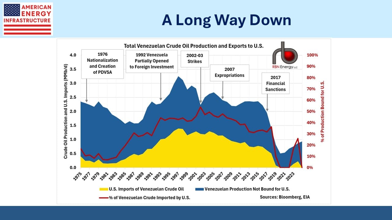 Venezuela and Mexico used to provide over half of US oil imports, which is why our refineries are set up to process the heavy crude they produce. Over the past couple of decades Canadian production gradually gained market share, as Venezuela’s Hugo Chavez and then Nicolas Maduro oversaw a steady degradation of their energy industry, exacerbated by nationalization of assets owned by US companies.