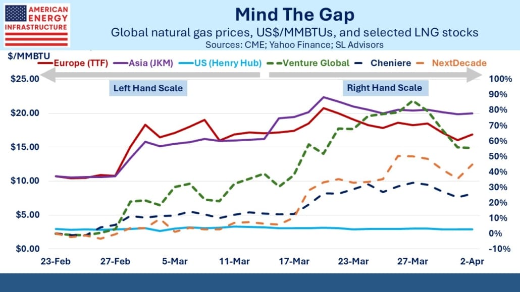 Venture Global’s (VG) Plaquemines facility was the strongest at exceeding stated capacity. Cheniere’s Sabine Pass and Corpus Christi terminals were also above. This allowed both companies to take advantage of the spike in European LNG prices caused by the disruption of flows through the Strait of Hormuz.
