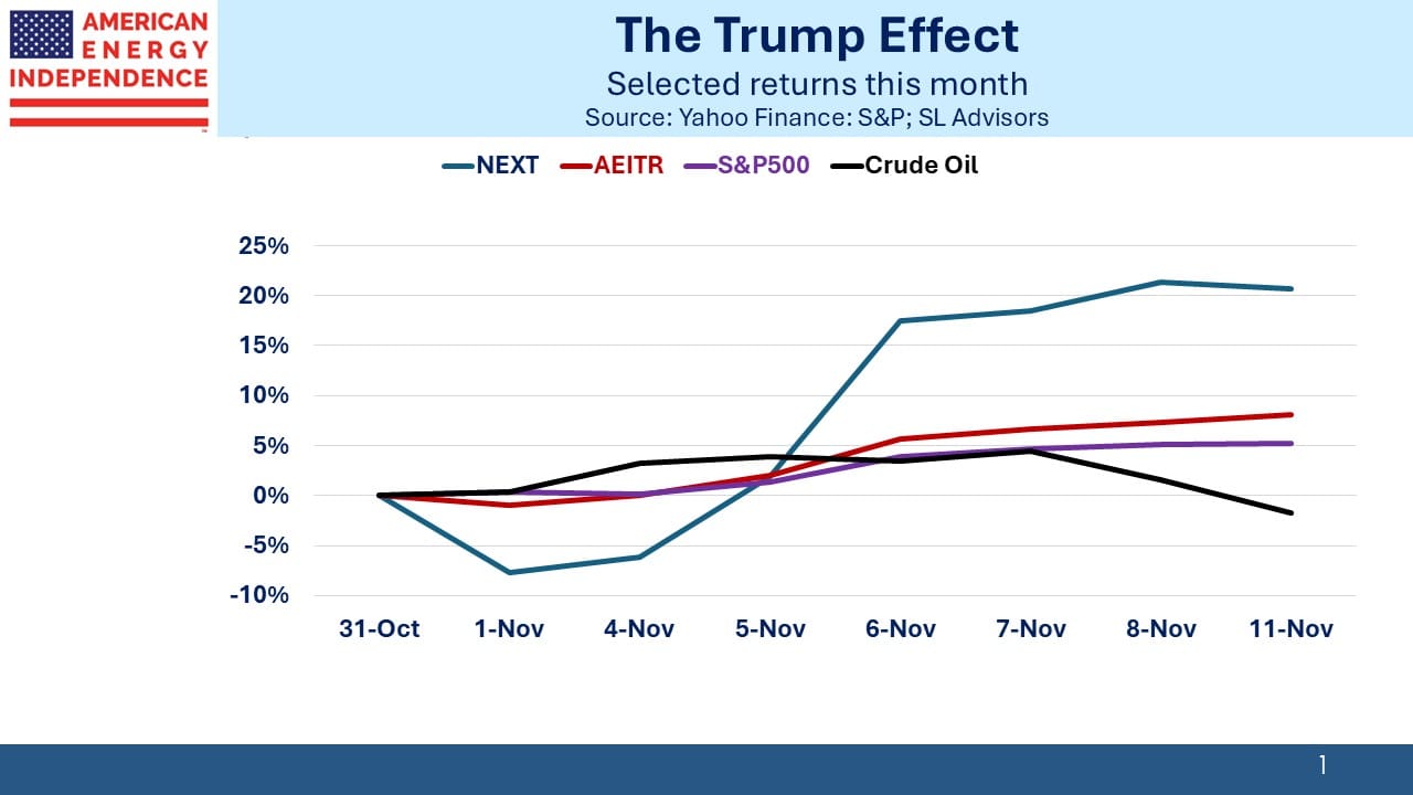 NextDecade rallied strongly following the election. Phase 2 of their development will now be freed of the LNG export permit pause that the Biden administration imposed early in the year. The more immediate challenge is for FERC to issue a revised Environmental Impact Statement after a DC circuit court rejected the one in hand (see Sierra Club Shoots Itself In The Foot).