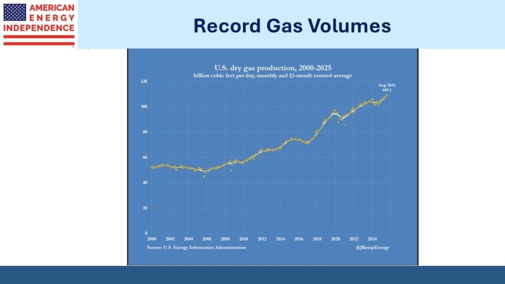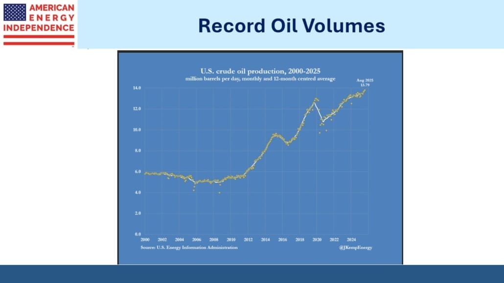 7. Oil and gas production reached new records in August, the most recent data available due to the government shutdown. It’s especially hard to reconcile this year’s weakness in pipelines with the volume growth in hydrocarbon output. AI stocks have been exciting, but we find steadily growing cashflows preferable (see Why Lower Oil Prices Will Boost Natural Gas).
